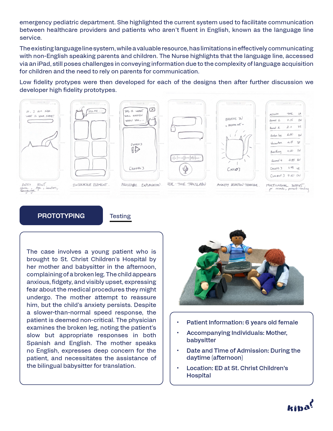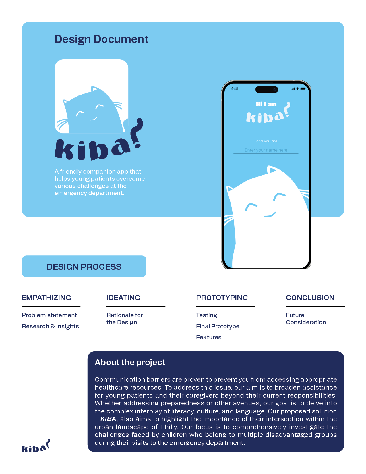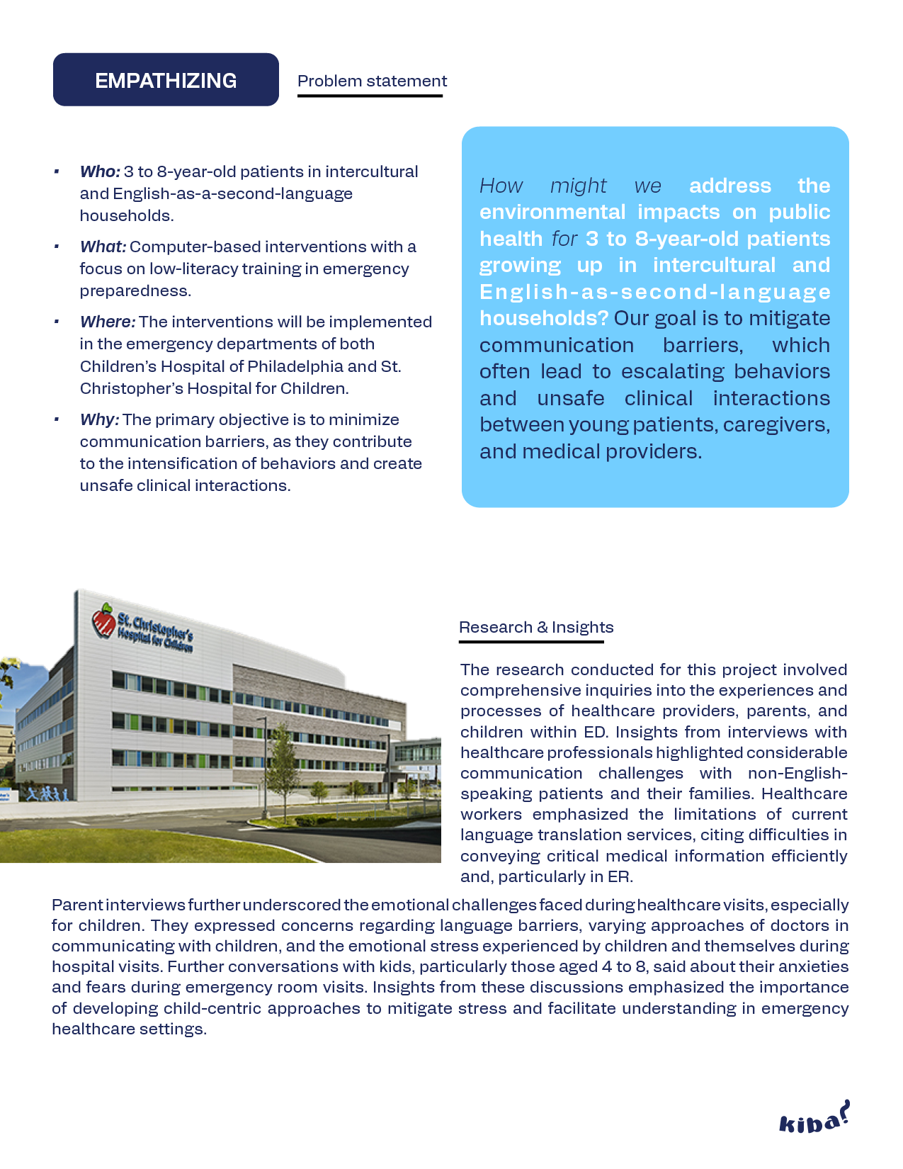 Communication barriers are proven to prevent you from accessing appropriate healthcare resources. To address this issue, our aim is to broaden assistance for young patients and their caregivers beyond their current responsibilities. Whether addressing preparedness or other avenues, our goal is to delve into the complex interplay of literacy, culture, and language. Our proposed solution – KIBA, also aims to highlight the importance of their intersection within the urban landscape of Philly. Our focus is to comprehensively investigate the challenges faced by children who belong to multiple disadvantaged groups during their visits to the emergency department.