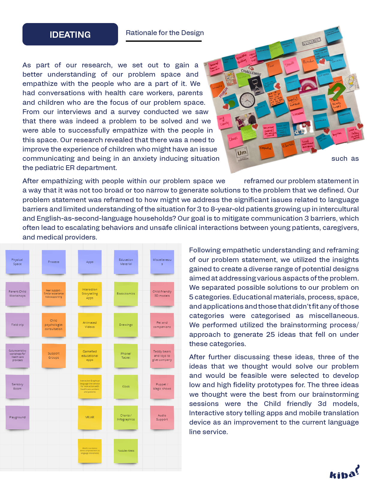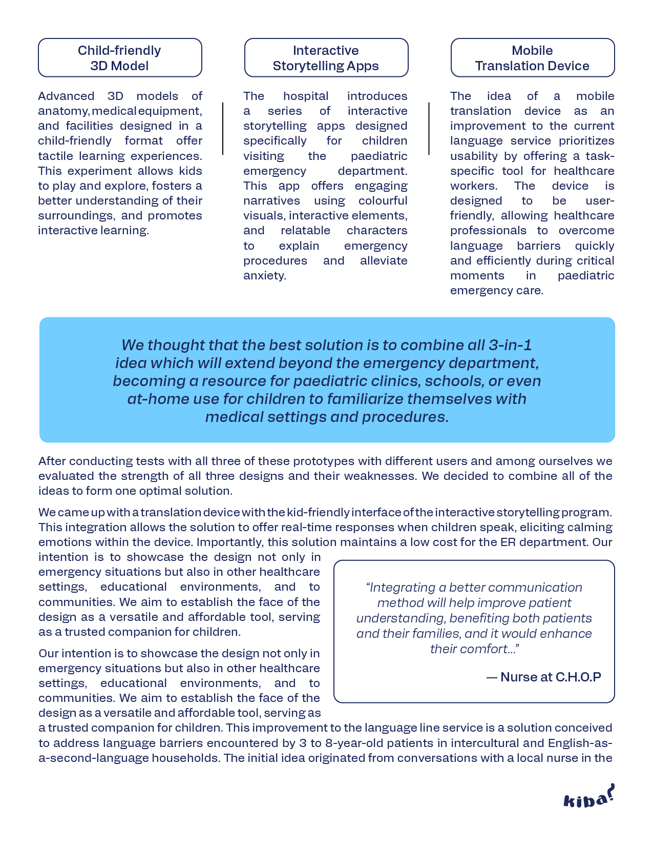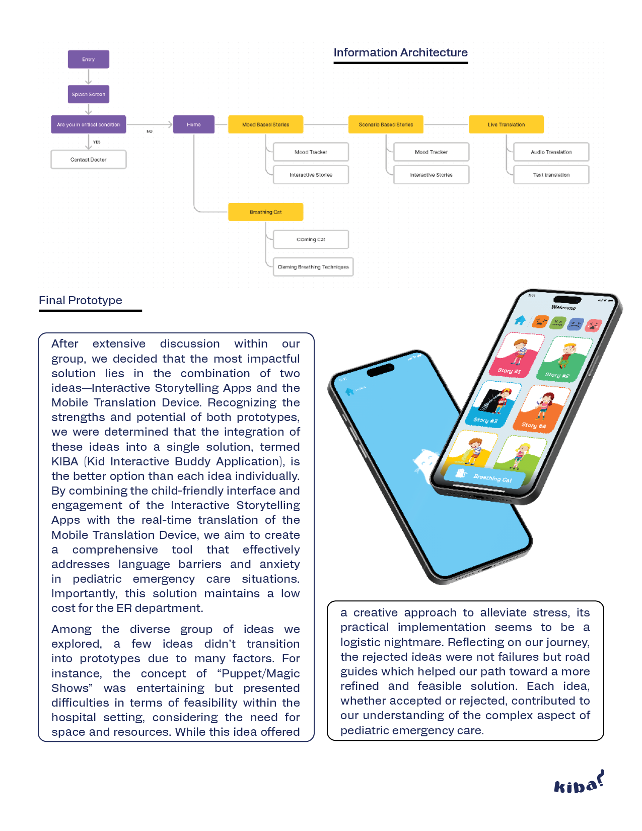 Communication barriers are proven to prevent you from accessing appropriate healthcare resources. To address this issue, our aim is to broaden assistance for young patients and their caregivers beyond their current responsibilities. Whether addressing preparedness or other avenues, our goal is to delve into the complex interplay of literacy, culture, and language. Our proposed solution – KIBA, also aims to highlight the importance of their intersection within the urban landscape of Philly. Our focus is to comprehensively investigate the challenges faced by children who belong to multiple disadvantaged groups during their visits to the emergency department.